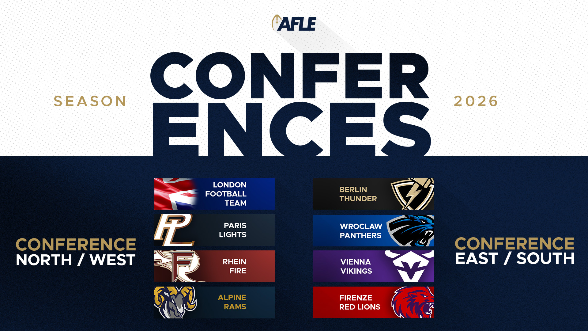 With the conference structure now confirmed, another important piece of the AFLE inaugural season is in place as the league continues its preparations for kickoff.
